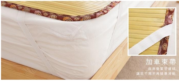 步驟五:加購束帶加購者可於竹蓆四個角落加車鬆緊帶,有助於竹蓆固定,減少滑動.如無特殊需求則不須加購.