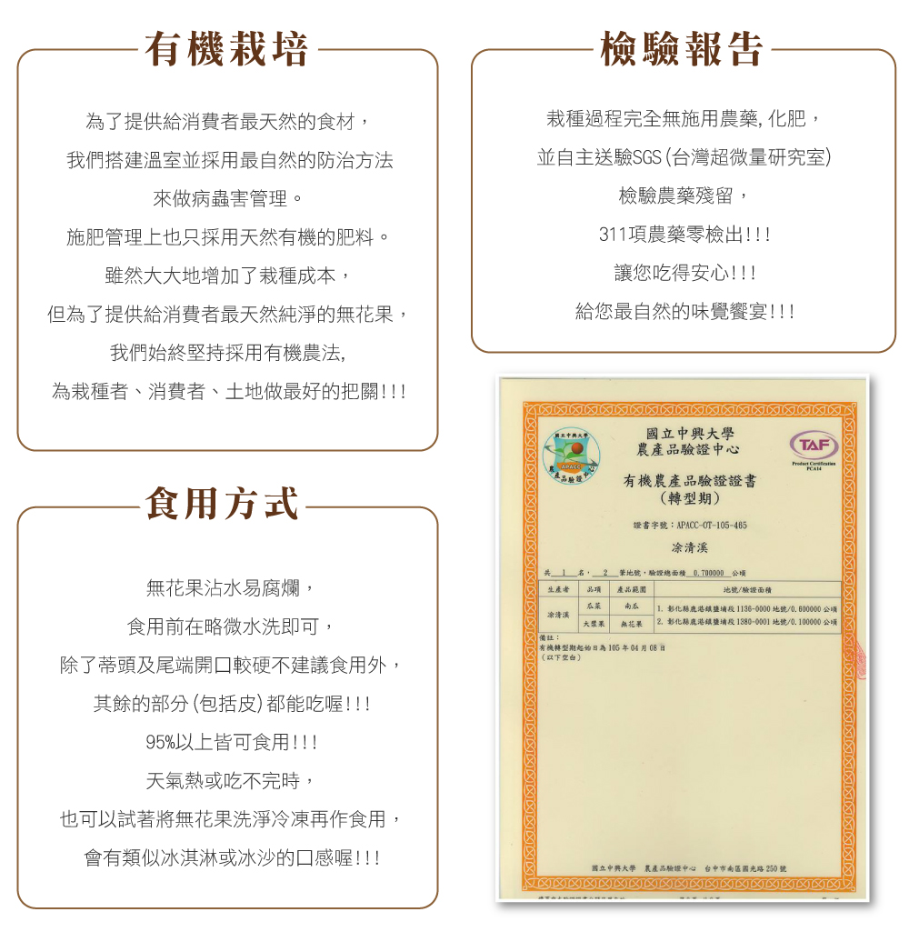 2. 因為採用有機農法栽植的農產品不施藥與無化肥,故若外觀上稍有瑕疵,乃屬正常狀況,敬請安心食用。